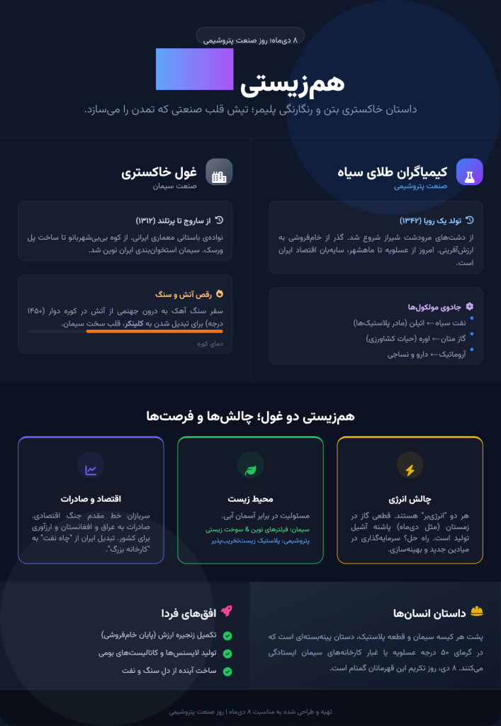 در نهایت، وقتی به ساختمان بلندی نگاه می‌کنید یا بطری آبی را در دست می‌گیرید، به یاد داشته باشید که این‌ها فقط اشیاء نیستند. این‌ها حاصل رقص شکوهمند آتش و سنگ، و همت بلند مردان و زنانی هستند که تصمیم گرفتند از دلِ خاک و نفت، آینده را بسازند.