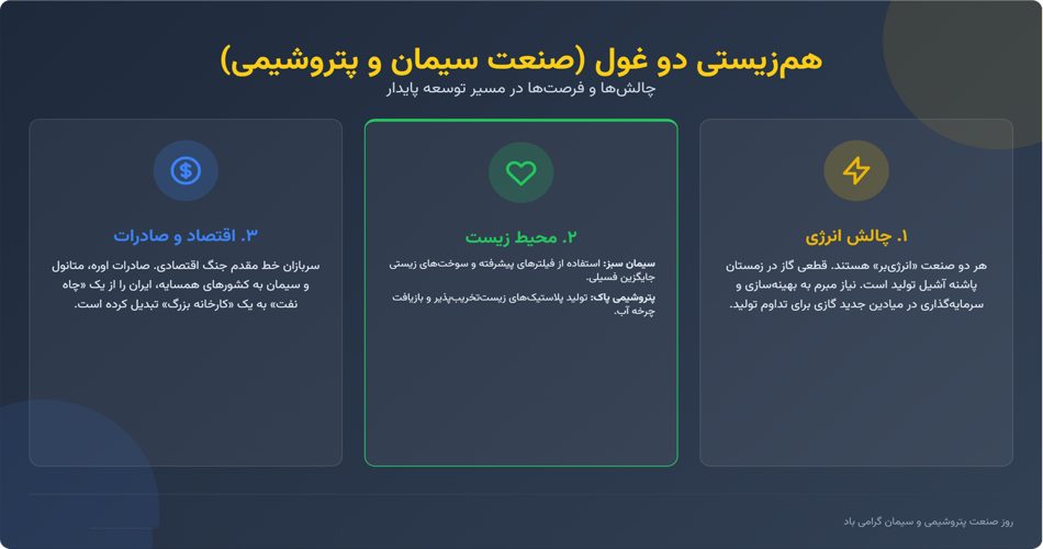 ۱. چالش انرژی: هر دو صنعت، “انرژی‌بر” هستند. سیمان برای چرخاندن کوره‌هایش و پتروشیمی برای فرآیندهای شیمیایی، عطش زیادی به گاز و برق دارند. در زمستان‌ها (مثل همین دی‌ماه)، وقتی گاز خانگی اولویت پیدا می‌کند، گاز این صنایع قطع می‌شود. این “قطعی گاز”، پاشنه آشیل هر دو صنعت است که تولید را متوقف کرده و هزینه‌ها را بالا می‌برد. روز صنعت پتروشیمی و سیمان، فرصتی است تا فریادِ “نیاز به بهینه‌سازی انرژی” و سرمایه‌گذاری در میادین گازی جدید شنیده شود.
