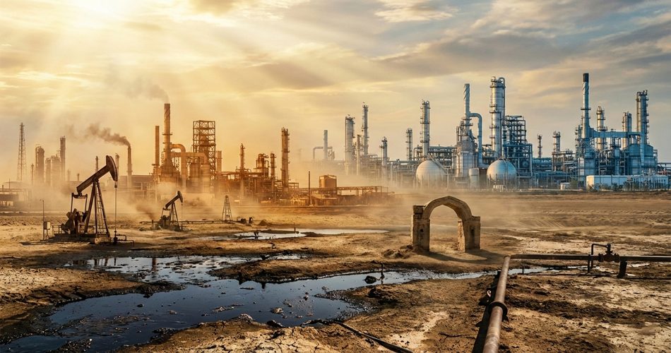 نمایی سینمایی از یک پالایشگاه صنعتی عظیم در هنگام غروب آفتاب؛ برج‌ها و سازه‌های فلزی بلند با لوله‌های درهم‌تنیده در نور طلایی آسمان دیده می‌شوند. دود و شعله‌هایی از دودکش‌ها به هوا برخاسته و در پیش‌زمینه، فردی تنها از پشت در مرکز تصویر ایستاده است. فضا حماسی، صنعتی و واقع‌گرایانه با نورپردازی دراماتیک